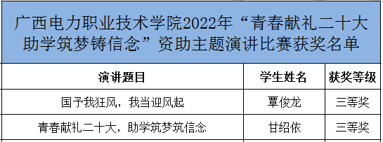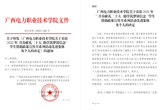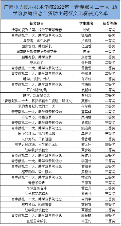 近日,2022广西电力职业技术学院“青春献礼二十大 助学筑梦铸信念”学生资助政策宣传月系列活动公布获奖结果,我院学生喜获多项荣誉:资助主题征文比赛活动中荣获一等奖五项,二等奖十二项,三等奖十九项;资助主题演讲比赛荣获三等奖两项。