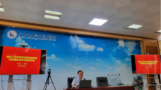 为进一步加强学院教职工对学校采购管理办法及采购OA线上具体操作步骤的了解,推进依法行政和采购流程规范化,我院于2022年6月27日在科园校区行政办公楼七楼会议室组织召开采购管理制度暨采购廉政教育专题培训会。本次专题培训会由建筑工程学院副院长、学院党总支纪检委员肖郑做专题介绍,学院领导班子成员及全体教职工出席本次培训会。