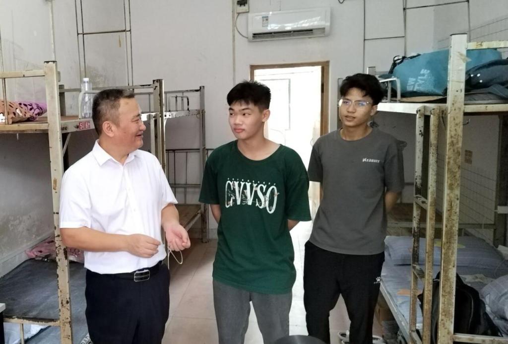 当日中午,校长赵峰、学校党委副书记龙伟忠,深入迎新现场看望慰问新生及家长,全面指导迎新工作。两位校领导对我院迎新工作给予充分肯定,叮嘱工作人员要热情、周到、细致地做好迎新服务工作,营造温心、舒适的校园环境。期间,赵峰校长在相关部门负责人的陪同下,深入我院3栋学生宿舍看望新生,为新生送上关怀和祝福,并亲切地与他们拉家常,详细询问他们的家庭情况及个人打算,鼓励他们尽快适应大学的学习和生活,勉励他们认真谋划三年大学生涯,确立正确的奋斗目标,并努力追逐实现梦想。