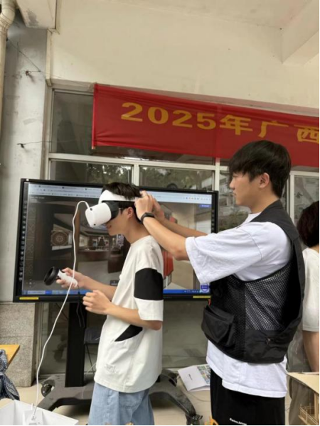 活动现场精心设置非遗传承、科技赋能、技能展示三大主题展区。在我院非遗文化工作室与侗乡雅社大学生社团协同运作下,学生团队以现场采集的影像素材为创作蓝本,将实时传输的活动照片与壮族传统纹样创新融合,通过数字化建模技术即时生成兼具民族特色与现代审美的文创作品,引得观展学子争相收藏;VR交互体验区采用虚实融合技术,师生佩戴专业设备穿梭于虚拟建筑空间,从结构解析到装饰设计实现全流程交互操作,真实还原的工程场景与智能辅助系统让职业教育创新成果具象可感。