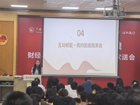 在“匿名树洞提问”与“直面律师大佬”环节。韦黎老师筛选高频问题后,由覃律师逐一解答,结合法律条款剖析问题本质,给出具体解决方案。开放麦克风环节中,班级骨干主动举手提问,围绕 “社团收费是否合规”“兼职受伤能否索赔” 等话题与覃律师深度交流,现场互动氛围热烈,进一步扫清同学们的法律认知盲区。